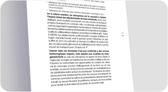 et déjà à plusieurs niveaux pour réduire les coûts et les émissions de CO associées à leur logistique : 2 • Réduction des chaînes logistiques longues ; • Optimisation des flux logistiques (optimisation des trajets, logis- tique inverse, etc.) ; • Utilisation des modes de transport alternatifs à la route et à l’aérien (maritime, fluvial, ferroviaire) et hybridation des modes de transport (intermodalité) ; • Utilisation de véhicules bas-carbone (électrique, hydrogène, etc.). De la même manière, les entreprises ont la capacité à réduire l’impact climat des déplacements de leurs employés, en les sen- sibilisant, en les incitant à se tourner vers des modes de transport propres (transports en commun, vélo, covoiturage, autopartage), voire en repensant l’organisation du travail pour réduire structurel- lement les déplacements professionnels et l’empreinte immobilière 29 (outils de collaboration à distance, promotion du télétravail)10. Selon l’ADEME, les déplacements professionnels (voyages d’affaires et trajets domicile-travail) sont le premier poste d’émission de gaz à effet de serre des activités de bureau (12 millions de tonnes par an), en raison particulièrement de l’utilisation de la voiture comme 11 moyen de transport pour 3 trajets sur 4 . Innover dans ces domaines n’est pas confronté à des verrous technologiques majeurs, mais appelle une conduite du chan- gement forte au sein des entreprises et auprès de leurs clients. Il s’agira par exemple de transformer les modèles d’affaires des en- treprises en recherchant des opportunités de création de valeur via de nouveaux services d’allongement de la durée de vie des produits, ou encore de favoriser les synergies de mutualisation ou 12 de substitution entre acteurs économiques . En interne, les entre- prises pourront notamment favoriser les moyens de transport en commun, surmonter la culture du présentéisme dans le monde du travail, ou encore favoriser la préférence de leurs services achats pour l’achat ou la location de produits de seconde main. 10 Good Planet. Entreprises : Guide pratique « Réduire les déplacements des collaborateurs ». 2011. 11 ADEME. Écoresponsable au Bureau : Actions efficaces et bonnes résolutions. Décembre 2017. P. 23. 12 CGDD. Ecologie industrielle et territoriale : le guide pour agir dans les territoires.2014 perspectives transatlantiques : les entreprises innovent pour le climat