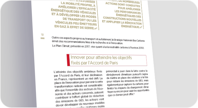 D’ici à 2028, pour se placer sur la trajec- bâtiments résidentiels et tertiaires (-54 % toire permettant à la France d’atteindre ses d’émissions), du secteur du transport objectifs, des efforts de réduction particu- (-29 %) et de l’industrie (-23 %). lièrement significatifs sont attendus des « DANS LE SECTEUR DES « DANS LE SECTEUR DU TRANSPORTS, LES ACTIONS BÂTIMENT, DE NOMBREUSES VISENT À FAVORISER ACTIONS SONT CONDUITES LA MOBILITÉ PROPRE, À POUR AMÉLIORER AMÉLIORER L’EFFICACITÉ LES PERFORMANCES ÉNERGÉTIQUE DES VÉHICULES ÉNERGÉTIQUES DES ET À DÉVELOPPER LES MODES CONSTRUCTIONS NOUVELLES DE TRANSPORT OU LES ET AMPLIFIER LA RÉNOVATION 5 VÉHICULES PEU ÉMETTEURS ÉNERGÉTIQUE. » 4 EN GAZ À EFFET DE SERRE. » 12 Outre ces aspects propres au transport et au bâtiment, la Stratégie Nationale Bas Carbone émet des recommandations liées à la recherche et à l’innovation. Le Plan Climat, présenté en 2017, vise quant à lui la neutralité carbone à l’horizon 2050. Innover pour atteindre les objectifs fixés par l’Accord de Paris L’atteinte des objectifs ambitieux fixés primordial à jouer dans la lutte contre le par l’Accord de Paris, et leur déclinaison dérèglement climatique puisqu’il s’agira en France, représentent un réel défi. La de mettre en place des solutions à la fois place de l’innovation pour parvenir à cette pour réduire les émissions de GES, mais transformation radicale est considérable : également pour capturer du carbone, pour afin que l’ensemble des secteurs de l’éco- limiter les impacts du changement clima- nomie et des acteurs concernés, puissent tique ou encore pour saisir les opportunités contribuer à l’effort global de réduction que ce dernier peut offrir.6 des émissions de GES, les acteurs vont devoir développer de nouveaux modèles d’affaires, de nouvelles pratiques moins émettrices et de nouvelles actions permet- tant de compenser des activités sources d’émission. L’innovation aura ainsi un rôle 4 https ://www.ecologique-solidaire.gouv.fr/strategie-nationale-bas-carbone-snbc 5 Ibid. 6 Innover face au changement climatique, INRA, UMR Innovation Montpellier, 2017 perspectives transatlantiques : les entreprises innovent pour le climat