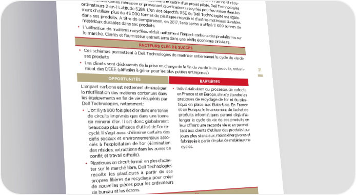 ❱ Recyclage de l’or et du plastique des PC et serveurs en fin de vie aux Etats-Unis DESCRIPTION DE LA SOLUTION / DIFFICULTÉS RENCONTRÉES • Aux Etats-Unis, les offres de financement de Dell Technologies permettent de redonner une seconde vie aux PC et serveurs. En effet, à l’issue des offres de location (leasing) conve- nues avec ses clients, le matériel informatique est soit réutilisé, soit en fin de vie et récu- péré pour être recyclé comme il se doit. Dans le cadre d’un projet pilote, Dell Technologies créé ainsi des cartes mères en or provenant d’ordinateurs recyclés pour les utiliser dans les ordinateurs 2-en-1 Latitude 5285. L’un des objectifs RSE de Dell Technologies est égale- ment d’utiliser plus de 45 000 tonnes de plastique recyclé et d’autres matériaux durables dans ses produits. A titre de comparaison, en 2017, l’entreprise a utilisé 11 600 tonnes de matériaux durables dans ses produits. • L’utilisation de matières recyclées réduit nettement l’impact carbone des produits mis sur le marché. Clients et fournisseur entrent ainsi dans une réelle économie circulaire. FACTEURS CLÉS DE SUCCÈS • Ces schémas permettent à Dell Technologies de maitriser entièrement le cycle de vie de ses produits • Les clients sont dédouanés de la prise en charge de la fin de vie de leurs produits, notam- 3131 ment des DEEE (difficiles à gérer pour les plus petites entreprises) OPPORTUNITÉS BARRIÈRES L’impact carbone est nettement diminué par • Industrialisation du processus de collecte la réutilisation des matières contenues dans en France et en Europe, afin d’y étendre les les équipements en fin de vie récupérés par pratiques de recyclage de l’or et du plas- Dell Technologies, notamment : tique en place aux Etats-Unis. En France • L’or : Il y a 800 fois plus d’or dans une tonne et en Europe, le financement de l’achat de de circuits imprimés que dans une tonne produits informatiques permet déjà d’al- de minerai d’or. Il est donc globalement longer le cycle de vie de ces produits en beaucoup plus efficace d’utilisé de l’or re- leur offrant une seconde vie et en permet- cyclé. Il s’agit aussi d’éliminer certains des tant aux clients d’utiliser des produits tou- défis sociaux et environnementaux asso- jours plus silencieux, moins énergivores et ciés à l’exploitation de l’or (élimination fabriqués à partir de plus de matériaux re- des résidus, extractions dans les zones de cyclés. conflit et travail difficile). • Plastiques en circuit fermé : en plus d’ache- ter sur le marché libre, Dell Technologies récolte les plastiques à partir de ses propres filières de recyclage pour créer de nouvelles pièces pour les ordinateurs de bureau et les écrans. ENSEIGNEMENTS CLÉS • Il est important de renforcer les messages en faveur de la collecte des métaux précieux. perspectives transatlantiques : les entreprises innovent pour le climat