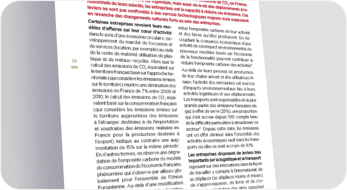 3| Repenser les modèles d’affaires des entreprises et leurs principes d’organisation De manière structurelle, l’évolution des modèles d’affaires vers une économie circulaire, basée sur une croissance économique qui ne serait plus corrélée avec un accroissement de l’impact environnemental, permettra de réduire les émissions liées à l’activité des en- treprises. Par ailleurs, le transport est le principal poste d’émissions de CO en France. 2 Par leurs actions en matière de logistique, mais aussi vis-à-vis des déplacements pro- fessionnels de leurs salariés, les entreprises ont la capacité à réduire ces émissions. Ces leviers ne sont pas confrontés à des verrous technologiques majeurs mais supposent en revanche des changements culturels forts au sein des entreprises. Certaines entreprises revoient leurs mo- solue l’empreinte carbone de leur activité dèles d’affaires sur leur cœur d’activité et des biens qu’elles produisent. En dé- dans le sens d’une économie circulaire : dé- couplant la croissance économique d’une veloppement du marché de l’occasion et activité de son impact environnemental, de de services (location, par exemple) au-delà nouveaux modèles basés sur l’économie de la vente de matériel, utilisation de plas- de la fonctionnalité peuvent contribuer à tique et de métaux recyclés. Alors que le réduire l’empreinte carbone des activités8 2828 . calcul des émissions de CO équivalent sur 2 Au-delà de leurs process de production, le territoire français basé sur l’approche ter- de leur chaîne amont et des utilisateurs fi- ritoriale (qui considère les émissions émises naux, l’activité des entreprises est sources sur le territoire) montre une diminution des d’impacts environnementaux liés à leurs émissions en France de 7 % entre 2000 et activités logistiques et aux déplacements. 2010, le calcul des émissions de CO équi- Les transports sont responsables de la plus 2 valent basé sur la consommation française grande partie des émissions françaises de (qui considère les émissions émises sur gaz à effet de serre (29 %), une proportion le territoire augmentées des émissions qui s’est accrue depuis 1991 compte tenu à l’étranger destinées à de l’importation de la difficulté particulière à décarboner ce et soustraites des émissions réalisées en secteur9 . Depuis cette date, les émissions France pour la production destinée à ont en effet diminué dans l’ensemble des l’export) indique au contraire une aug- activités économiques sauf dans les trans- mentation de 15 % sur la même période7 . ports où elles se sont accrues de 9,1 %. En d’autres termes, on observe une dégra- Les entreprises disposent de leviers très dation de l’empreinte carbone du modèle importants sur la logistique et le transport, de consommation de l’économie française, reposant sur des innovations dans la façon phénomène qui s’observe par ailleurs glo- de travailler y compris à l’international, de balement pour l’ensemble de l’Union se déplacer (se déplacer moins et mieux), Européenne. Au-delà d’une modification de s’approvisionner, de livrer et de s’or- des pratiques de consommation, les entre- ganiser (implantation des sites, jusqu’aux prises doivent donc revoir leur modèle de modèles d’affaires). Elles agissent d’ores production afin de réduire de manière ab- 7 ADEME, CITEPA, RAC. Les émissions importées – Le passager clandestin du commerce mondial. 2013 8 ADEME. op. cit. ; IDDRI. Économie du partage : enjeux et opportunités pour la transition écologique. Juillet 2014. p. 20- 23 9 Commissariat général au développement durable. Chiffres clés du transport - Édition 2018. Mars 2018. P. 51. perspectives transatlantiques : les entreprises innovent pour le climat