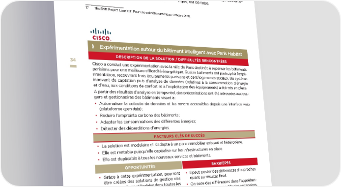 • Dans le même temps, les fabricants, terminaux connectés, notamment par- comme Dell Technologies ou Apple, ticuliers (visionnage de vidéos en ligne, innovent afin de réduire toujours davan- dont l’impact énergétique est environ tage la consommation électrique des 1 500 fois plus important que la consom- terminaux utilisateurs. Il faut toutefois mation électrique du smartphone 17 être vigilant à l’effet rebond et s’assu- lui-même) . Une certaine « sobriété nu- rer que ces gains d’efficience ne soient mérique », c’est-à-dire une modération pas intégralement compensés par la comportementale de l’usage du numé- croissance des usages et du nombre de rique, est de mise. 17 The Shift Project. Lean ICT : Pour une sobriété numérique. Octobre 2018. ❱ Expérimentation autour du bâtiment intelligent avec Paris Habitat DESCRIPTION DE LA SOLUTION / DIFFICULTÉS RENCONTRÉES 34 Cisco a conduit une expérimentation avec la ville de Paris destinée à repenser les bâtiments parisiens pour une meilleure efficacité énergétique. Quatre bâtiments ont participé à l’expé- rimentation, recouvrant trois équipements parisiens et cent logements sociaux. Un système innovant de captation puis d’analyse de données (relatives à la consommation d’énergie et d’eau, aux conditions de confort et à l’exploitation des équipements) a été mis en place. A partir des résultats d’analyse en temps réel, des préconisations ont été adressées aux usa- gers et gestionnaires des bâtiments visant à : • Automatiser la collecte de données et les rendre accessibles depuis une interface web (plateforme open data) ; • Réduire l’empreinte carbone des bâtiments ; • Adapter les consommations des différentes énergies ; • Détecter des déperditions d’énergies. FACTEURS CLÉS DE SUCCÈS • La solution est modulaire et s’adapte à un parc immobilier existant et hétérogène. • Elle est rentable puisqu’elle capitalise sur les infrastructures en place. • Elle est duplicable à tous les nouveaux services et bâtiments. OPPORTUNITÉS BARRIÈRES • Grâce à cette expérimentation, pourront • Il peut exister des différences d’approches être créées des solutions de gestion des quant au résultat final. consommations utilisables dans toutes les • On note des différences dans l’appréhen- villes. sion des métiers respectifs des partenaires. • Il s’agira également de répondre aux Plans Climat des villes. ENSEIGNEMENTS CLÉS • Une co-construction est nécessaire entre tous les acteurs. • Il est crucial de fixer en amont le « retour sur investissement » des parties prenantes. • Il faut être en mesure de répliquer rapidement pour étendre le périmètre des cas d’usage. ➥ Recommandation associée : RECOMMANDATION V perspectives transatlantiques : les entreprises innovent pour le climat