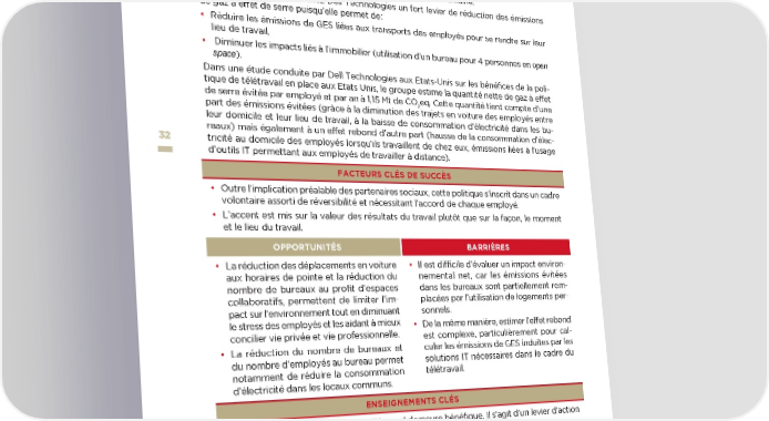 ❱ Politique de télétravail volontariste DESCRIPTION DE LA SOLUTION / DIFFICULTÉS RENCONTRÉES Dell Technologies s’est fixé pour objectif que 50 % de ses employés au niveau mondial puissent faire du télétravail d’ici à 2020.Une politique de télétravail a été mise en place en France en 2009. A Paris, actuellement, plus de 50 % des salariés rattachés au site sont éligibles au télé- travail et peuvent travailler depuis leur domicile 1 à 5 jours par semaine. Cette politique constitue chez Dell Technologies un fort levier de réduction des émissions de gaz à effet de serre puisqu’elle permet de : • Réduire les émissions de GES liées aux transports des employés pour se rendre sur leur lieu de travail, • Diminuer les impacts liés à l’immobilier (utilisation d’un bureau pour 4 personnes en open space). Dans une étude conduite par Dell Technologies aux Etats-Unis sur les bénéfices de la poli- tique de télétravail en place aux Etats Unis, le groupe estime la quantité nette de gaz à effet de serre évitée par employé et par an à 1,15 Mt de CO eq. Cette quantité tient compte d’une 2 part des émissions évitées (grâce à la diminution des trajets en voiture des employés entre leur domicile et leur lieu de travail, à la baisse de consommation d’électricité dans les bu- reaux) mais également à un effet rebond d’autre part (hausse de la consommation d’élec- 3232 tricité au domicile des employés lorsqu’ils travaillent de chez eux, émissions liées à l’usage d’outils IT permettant aux employés de travailler à distance). FACTEURS CLÉS DE SUCCÈS • Outre l’implication préalable des partenaires sociaux, cette politique s’inscrit dans un cadre volontaire assorti de réversibilité et nécessitant l’accord de chaque employé. • L’accent est mis sur la valeur des résultats du travail plutôt que sur la façon, le moment et le lieu du travail. OPPORTUNITÉS BARRIÈRES • La réduction des déplacements en voiture • Il est difficile d’évaluer un impact environ- aux horaires de pointe et la réduction du nemental net, car les émissions évitées nombre de bureaux au profit d’espaces dans les bureaux sont partiellement rem- collaboratifs, permettent de limiter l’im- placées par l’utilisation de logements per- pact sur l’environnement tout en diminuant sonnels. le stress des employés et les aidant à mieux • De la même manière, estimer l’effet rebond concilier vie privée et vie professionnelle. est complexe, particulièrement pour cal- • La réduction du nombre de bureaux et culer les émissions de GES induites par les du nombre d’employés au bureau permet solutions IT nécessaires dans le cadre du notamment de réduire la consommation télétravail. d’électricité dans les locaux communs. ENSEIGNEMENTS CLÉS • L’impact net de la politique de télétravail demeure bénéfique. Il s’agit d’un levier d’action majeur car applicable à tous secteurs et types d’entreprises. perspectives transatlantiques : les entreprises innovent pour le climat