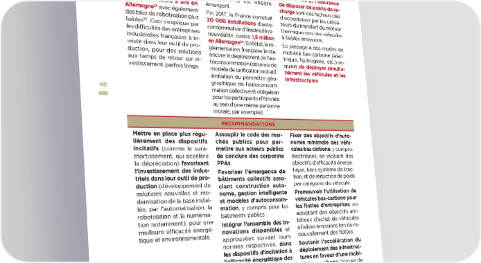 V. Réaffirmer les ambitions de baisse des consommations énergétiques dans l’industrie, les bâtiments et les transports, assortis d’incitations et d’accompa- gnement au déploiement des solutions clés dans ces secteurs : Industrie Bâtiments Transports POINTS DE BLOCAGE L’âge moyen des machines Le marché français des cor- L’autonomie et l’assurance dans l’industrie française est porate PPAs est encore de disposer de points de re- de 19 ans, contre 9 ans en émergent. charge sont des facteurs clés Allemagne22 avec également Fin 2017, la France comptait d’acceptation par les utilisa- des taux de robotisation plus 20 000 installations d’auto- teurs du transfert du moteur 23 thermique vers des véhicules faibles . Ceci s’explique par consommation d’électricité re- les difficultés des entreprises nouvelable, contre 1,5 million à faibles émissions. industrielles françaises à in- 24 en Allemagne . En l’état, la ré- Le passage à des modes de vestir dans leur outil de pro- glementation française limite mobilité bas-carbone (élec- duction, pour des solutions encore le déploiement de l’au- trique, hydrogène, etc.) re- aux temps de retour sur in- toconsommation (absence de quiert de déployer simulta- vestissement parfois longs. modèle de tarification incitatif, nément les véhicules et les limitation du périmètre géo- infrastructures graphique de l’autoconsom- 4848 mation collective et obligation pour les participants d’être liés au sein d’une même personne morale, par exemple). RECOMMANDATIONS Mettre en place plus régu- Assouplir le code des mar- Fixer des objectifs d’auto- lièrement des dispositifs chés publics pour per- nomie minimale des véhi- incitatifs (comme le sura- mettre aux acteurs publics cules bas carbone, y compris mortissement, qui accélère de conclure des corporate électriques, en incluant des la dépréciation) favorisant PPAs. objectifs d’efficacité énergé- l’investissement des indus- Favoriser l’émergence de tique, hors système de trac- triels dans leur outil de pro- bâtiments collectifs asso- tion, et de réduction de poids duction (développement de ciant construction auto- par catégorie de véhicule solutions nouvelles et mo- nome, gestion intelligente Promouvoir l’utilisation de dernisation de la base instal- et modèles d’autoconsom- véhicules bas-carbone pour lée, par l’automatisation, la mation, y compris pour les les flottes d’entreprises, en robotisation et la numérisa- bâtiments publics. adoptant des objectifs am- tion notamment), pour une Intégrer l’ensemble des in- bitieux d’achat de véhicules meilleure efficacité énergé- novations disponibles et à faibles émissions lors du re- tique et environnementale. approuvées suivant leurs nouvellement des flottes. normes respectives, dans Soutenir l’accélération du les dispositifs d’incitation à déploiement des infrastruc- l’efficacité énergétique des tures en faveur d’une mobi- bâtiments existants. lité bas-carbone (bornes de recharge de véhicule élec- trique, stations hydrogène) par les collectivités et les délégataires de services pu- blics (parkings, etc.). 22 Fédération des industries mécaniques, 2014 23 Fédération internationale de la robotique, 2018 24 Commission de régulation de l’énergie, 2018 perspectives transatlantiques : les entreprises innovent pour le climat