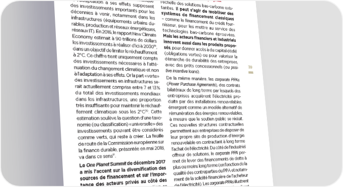 € 5| Innover dans le financement des solutions bas-carbone La cible des 1,5 °C ne pourra être atteinte sans une mobilisation à une échelle nouvelle des financements privés vers une économie décarbonée, aundelà de la limitation de leur expo- sition au risque climat. Il s’agit de financer les innovations de rupture, mais surtout d’innover pour financer le déploiement massif des technologies basncarbone existantes, comme les énergies renouvelables, l’efficacité énergétique ou les transports urbains propres. L’atténuation du changement climatique l’échelle des solutions bas-carbone exis- et l’adaptation à ses effets supposent tantes. Il peut s’agir de mobiliser des des investissements importants pour les systèmes de financement classiques décennies à venir, notamment dans les – comme le financement du crédit four- infrastructures (équipements urbains du- nisseur, pour les mettre au service des rables, production et réseaux énergétiques, technologies bas-carbone éprouvées. réseaux IT). En 2016, le rapport New Climate Mais les acteurs financiers et industriels Economy estimait à 90 trillions de dollars innovent aussi dans les produits propo- les investissements à réaliser d’ici à 203019 sés, pour donner accès à du capital dédié , dans un objectif de limiter le réchauffement (obligations vertes) ou pour valoriser la à 2°C. Ce chiffre tient uniquement compte démarche de durabilité des entreprises, des investissements nécessaires à l’atté- avec des prêts concessionnels (ou posi- 39 nuation du changement climatique et non tive incentive loans). à l’adaptation à ses effets. Or la part « verte » De la même manière, les corporate PPAs des investissements en infrastructures se- (Power Purchase Agreements), des contrats rait actuellement comprise entre 7 et 13 % bilatéraux de long terme par lesquels des du total des investissements mondiaux entreprises acquièrent l’électricité pro- dans les infrastructures, une proportion duite par des installations renouvelables très insuffisante pour maintenir le réchauf- émergent comme un modèle alternatif de 20 fement climatique sous les 2°C . Cette rémunération des énergies renouvelables, estimation soulève la question d’une taxo- à mesure que le soutien public se réduit. nomie (ou classification) « universelle » des Ces nouvelles structures contractuelles investissements pouvant être considérés permettent aux entreprises de disposer de comme verts, qui reste à créer. La feuille leur propre site de production d’énergie de route de la Commission européenne sur renouvelable en contractant à long terme la finance durable, présentée en mai 2018, l’achat de l’électricité. Du côté de l’industriel 21 va dans ce sens . offreur de solutions, le corporate PPA per- Le One Planet Summit de décembre 2017 met de lever des financements de dette à a mis l’accent sur la diversification des plus ou moins long terme (en fonction de la sources de financement et sur l’impor- qualité des contreparties du PPA et notam- tance des acteurs privés au côté des ment de la solidité financière de l’acheteur financements publics. La question se de l’électricité). Les corporate PPAs illustrent pose du financement des innovations les multiples facettes de l’innovation climat de rupture, mais aussi et surtout de la conduite par les entreprises, au-delà de l’in- capacité à utiliser l’effet de levier des fi- novation technologique (innovation dans nancements privés pour un passage à les modèles d’affaires). 19 The New Climate Economy. The sustainable infrastructure imperative : financing for better growth and development. 2016. P. 10. A noter qu’il ne s’agit pas là d’investissements additionnels. Dans un scénario sans effort de lutte contre le réchauffement climatique, les besoins d’investissements seraient du même ordre. 20 Commission Pascal Canfin – Alain Grandjean. Mobiliser les financements pour le climat : une feuille de route pour financer une économie décarbonée. Juin 2015. P. 11. 21 Commission européenne. Legislative proposals on sustainable finance. Mai 2018. perspectives transatlantiques : les entreprises innovent pour le climat