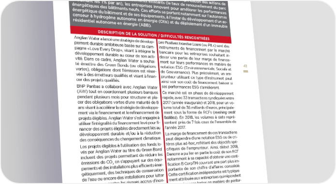 OBLIGATIONS VERTES : L’EXEMPLE D’ANGLIAN WATER POSITIVE INCENTIVE LOANS ❱ Financements verts Les bâtiments (résidentiels et tertiaires) représentent 20 % des émissions de gaz à ef- fet de serre françaises. Il s’agit du secteur qui devra consentir les efforts de réduction les plus significatifs, avec une baisse de 54 % des émissions entre 2013 et 2028 dans le cadre de la stratégie nationale bas carbone. En plus de l’amplification des actions de rénovation énergétique des bâtiments existants (le taux de renouvellement du parc avoisinant les 1 % par an), les entreprises innovent pour améliorer les performances énergétiques des bâtiments neufs. Ces efforts se portent notamment sur l’autonomie énergétique du bâtiment et de ses équipements, à l’instar du développement d’un as- censeur à hydrogène autonome en énergie (Otis) et du déploiement d’un immeuble résidentiel autonome en énergie (ABB). DESCRIPTION DE LA SOLUTION / DIFFICULTÉS RENCONTRÉES Anglian Water a lancé une stratégie de dévelop- Les Positives Incentive Loans (ou PILs) sont des pement durable ambitieuse basée sur sa cam- instruments de financement par le marché pagne « Love Every Drop », visant à intégrer le bancaire pour les entreprises souhaitant in- développement durable au cœur de son acti- dexer une partie de leur marge de finance- vité. Dans ce cadre, Anglian Water a souhai- ment sur leurs performances en matière de 4141 té émettre des Green Bonds (ou obligations notation ESG (Environnementale, Sociale et vertes), obligations dont l’émission est réser- de Gouvernance). Plus précisément, un em- vée à des émetteurs qualifiés et visant à finan- prunteur utilisant ce type d’instrument peut cer des projets qualifiés. ainsi voir son coût de financement baisser si BNP Paribas a collaboré avec Anglian Water ses performances ESG s’améliorent. (AW) tout en coordonnant plusieurs banques Ce marché est en phase de développement pendant plusieurs mois pour structurer et pla- rapide, avec 33 transactions syndiquées entre cer des obligations vertes d’une maturité de 8 2017 (année inaugurale) et 2018, pour un vo- ans visant à accélérer la stratégie de développe- lume total de 36 milliards d’euros, principale- ment via le financement et le refinancement de ment sous la forme de RCFs (revolving credit projets éligibles. Anglian Water s’est engagée à facilities). En 2018, les volumes à date repré- utiliser l’intégralité du financement levé pour fi- sentent près de 7 fois ceux de l’ensemble de nancer des projets éligibles directement liés au l’année 2017. développement durable et/ou à la réduction La marge de financement de ces transactions des conséquences du changement climatique. peut dépendre d’une notation ESG ou de cri- Les projets éligibles à l’utilisation des fonds le- tères plus ad-hoc, reflétant des objectifs spé- vés par Anglian Water au titre du Green Bond cifiques de l’emprunteur. Ainsi, début 2018, incluent des projets permettant de réduire les Danone a pu lier en partie le coût de son RCF émissions de CO en s’appuyant sur des équi- notamment à sa capacité d’obtenir une certi- 2 pements et des installations plus efficients éner- fication B CorpTM couvrant une part plus im- gétiquement, des techniques de conservation portante de son chiffre d’affaires consolidé. de l’eau ou encore des installations pour lutter Cette certification indépendante est typique- à long terme contre les risques accrus d’inon- ment attribuée aux entreprises qui répondent dations en raison du réchauffement climatique. à des exigences fortes en matière de perfor- Ces engagements seront suivis tout au long de mance sociale et environnementale. la vie des obligations. L’identification de la mesure de performance Le cadre de financement d’Anglian Water a fait durable de l’entreprise est cruciale, et les ob- l’objet d’un processus de revue par une tierce jectifs doivent être ambitieux. Jusqu’à présent, partie indépendante (DNV GL), certifiant son ces instruments ont dès lors été réservés à alignement avec les principes applicables aux des emprunteurs avancés sur ces probléma- obligations vertes (« Green Bond Principles »). tiques de développement durable, qui ont no- tamment mis en place des reportings détail- lés et un suivi de leurs différents scores ESG. perspectives transatlantiques : les entreprises innovent pour le climat