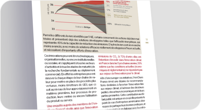 Le rôle prépondérant du déploiement des solutions bas-carbone est illustré par la modé- lisation de l’Agence Internationale de l’Energie, qui identifie l’écart entre les émissions résultant des engagements pris par les Etats (Intended Nationally Determined Contributions ou INDCs) et un scénario permettant de demeurer sur une trajectoire 2°C (Bridge) (AIE)7 : Réduction des émissions mondiales de GES liées à l’énergie par mesure dans le scénario Bridge par rapport au scénario INDC 38 Scénario INDC Réduction des émissions 37 15% de méthane amont (secteur pétrolier et gazier) 9% Amélioration de l’efficacité des centrales à charbon 36 17% Investissement dans eq2 les renouvelables 10% Réforme des subventions Mt CO35 aux énergies fossiles 34 49% Efficacité énergétique Scénario Bridge 33 Parmi les différents leviers identifiés par l’AIE, certains concernent des actions déjà bien mai- 13 trisées et présentent déjà des solutions développées telles que l’efficacité énergétique, qui représente 49 % de la capacité de réduction des émissions. D’autres leviers sont en revanche moins avancés, avec moins de solutions efficaces réellement développées à l’heure actuelle, et nécessitent d’importants efforts d’innovation. Ces innovations peuvent être technologiques, émissions de CO . Si 75 % d’entre elles ont 2 organisationnelles, ou encore institutionnelles l’intention d’investir dans l’innovation climat ou sociales, et s’appliquent à tous les secteurs en France dans les 5 prochaines années, 59 % d’activités et à tous les stades de maturité (de estime que les conditions actuelles (écono- la recherche fondamentale au déploiement miques et réglementaires) ne répondent pas commercial). En effet les entreprises peuvent aux enjeux de l’innovation pour le climat. innover à chaque étape de leur chaîne de va- Afin d’encourager ces initiatives, l’AmCham leur pour mettre en place des procédés plus France émet une dizaine de recommanda- vertueux, moins émetteurs de GES, que ce tions destinées à favoriser l’innovation liée soit au niveau de leur approvisionnement en aux enjeux climat, à l’adresse des décideurs matières premières, leur processus de pro- publics, des acteurs économiques et de leurs duction, leurs ventes ou encore l’utilisation parties prenantes. Cette contribution au dé- du produit ou service. bat public est unique en ce qu’elle présente le Une enquête auprès des membres de l’Am- point de vue d’entreprises américaines dési- 8 Cham France révèle ainsi que l’innovation reuses de partager leurs bonnes pratiques, et en faveur du climat figure parmi les priori- qui s’appuient sur un dialogue avec les entre- tés stratégiques de 69 % de ses entreprises, prises françaises et européennes membres une majorité d’entre elles ayant déjà défini de l’AmCham France dans leur réflexion sur des objectifs concrets de réduction de leurs les questions climatiques. 7 AIE. World Energy Outlook Special Report : Energy and Climate Change. 2015. P. 74. 8 Enquête conduite en ligne et par téléphone auprès des dirigeants des entreprises membres de l’AmCham France en octobre et novembre 2018 (102 entreprises répondantes, représentatives de l’ensemble des secteurs de l’économie). Les secteurs les plus représentés sont l’énergie et les transports, ainsi que le secteur technologique, qui représentent chacun plus de 20 % des répondants. Les secteurs financier, pharmaceutique, agro-alimentaire, le conseil et le luxe sont également représentés. Enfin, l’échantillon est représentatif de la diversité des implantations géographiques sur le territoire, en Ile-de-France et en régions. perspectives transatlantiques : les entreprises innovent pour le climat