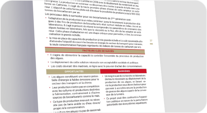 ème ❱ Production de biocarburant de 3 génération à partir d’algues DESCRIPTION DE LA SOLUTION / DIFFICULTÉS RENCONTRÉES Suite à une collaboration débutée en 2009, ExxonMobil et Synthetic Genomics, Inc ont dé- veloppé une souche d’algues capable de convertir le carbone en une quantité suffisante de corps gras riche en énergie pouvant ensuite être transformée en biodiesel. Cette innovation permettrait d’utiliser des algues comme carburant bas-carbone dans le secteur du transport. Une étape supplémentaire a été franchie en 2018 avec le doublement du rendement en ma- tière grasse. La production en extérieur va désormais être testée à grande échelle dans une ferme en Californie. Il s’agit de la toute première phase d’essai de cette ampleur en exté- rieur. L’objectif de cette ferme pilote est d’évaluer la possibilité de produire jusqu’à 500 000 tonnes de biocarburant par an. ème génération sont : Les principaux défis à surmonter pour ces biocarburants de 3 • l’adaptation de la production à un milieu extérieur : jusqu’à récemment, la production d’al- gues à des fins de production de biocarburants était surtout réalisée en milieu clos et en laboratoires. Il s’agit à présent de réussir à comprendre les paramètres de croissance des algues testées en laboratoire, tels que la viscosité ou le flux, afin de les adapter en exté- rieur. Cette phase d’adaptation est une étape critique pour permettre, in fine, la commer- cialisation à grande échelle. • la mise en place de capacités de production à très grande échelle et à coût raisonnable afin 2727 d’atteindre l’objectif de couvrir les besoins en énergie du secteur du transport (pour mémoire, la seule consommation française représente 40 millions de tonnes de carburant par an). FACTEURS CLÉS DE SUCCÈS • Il s’agira de démontrer la capacité à contrôler l’ensemble du processus de production des algues. • Le déploiement de cette solution nécessite son acceptabilité sociétale et politique. • Les coûts devront être maitrisés, en ligne avec le pouvoir d’achat des consommateurs. OPPORTUNITÉS BARRIÈRES • Les algues constituent une source poten- • Un long travail de recherche en laboratoire tielle d’énergie à faibles émissions pour le demeure nécessaire au déploiement de la secteur des transports et la chimie. production de ces algues, en faisant va- • Leur production n’entre pas en compétition rier la production sous divers facteurs pour avec les cultures et productions destinées parvenir à accroître encore la production à l’alimentation, contrairement à d’autres de graisse des algues à partir de la conver- sources de biocarburants comme le maïs. sion de la lumière. • Ce type de production innovant ne néces- • Ce projet peut être confronté à l’opposi- site pas de terre arable ou d’eau douce/ tion publique en raison de la perturbation propre à la consommation. potentielle des écosystèmes aquatiques. • La culture des algues n’a pas de saisonnali- té particulière, elles peuvent donc être pro- duites tout au long de l’année. ENSEIGNEMENTS CLÉS • Les algues constituent une source durable d’énergie renouvelable bas-carbone, adaptée à une utilisation rapide dans le transport, sans attendre une transformation du parc de vé- hicules, et en utilisant les infrastructures de distribution existantes. • Il s’agit d’un pilote industriel d’une production qui pourra alimenter les raffineries dans le futur. ➥ Recommandation associée : RECOMMANDATION I perspectives transatlantiques : les entreprises innovent pour le climat