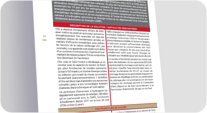 ASCENSEUR À HYDROGÈNE IMMEUBLE RÉSIDENTIEL AUTONOME AUTONOME EN ÉNERGIE EN ÉNERGIE (Brütten – Suisse) ❱ l’autonomie énergétique des bâtiments et de leurs équipements Les bâtiments (résidentiels et tertiaires) représentent 20 % des émissions de gaz à ef- fet de serre françaises. Il s’agit du secteur qui devra consentir les efforts de réduction les plus significatifs, avec une baisse de 54 % des émissions entre 2013 et 2028 dans le cadre de la stratégie nationale bas carbone. En plus de l’amplification des actions de rénovation énergétique des bâtiments existants (le taux de renouvellement du parc avoisinant les 1 % par an), les entreprises innovent pour améliorer les performances énergétiques des bâtiments neufs. Ces efforts se portent notamment sur l’autonomie énergétique du bâtiment et de ses équipements, à l’instar du développement d’un as- censeur à hydrogène autonome en énergie (Otis) et du déploiement d’un immeuble résidentiel autonome en énergie (ABB). DESCRIPTION DE LA SOLUTION / DIFFICULTÉS RENCONTRÉES Otis a déployé d’importants efforts de R&D ABB a inauguré en 2016 à Brütten (Suisse) un pour mettre au point un ascenseur autonome immeuble résidentiel intégralement autonome 2 2222 énergétiquement. Des avancées ont déjà été en énergie. Grâce à ses 1 000 m de panneaux réalisées depuis de nombreuses années en photovoltaïques installés en toiture et façades, matière d’efficacité énergétique pour réduire le bâtiment produit suffisamment d’énergie les besoins de la cabine (éclairage LED, par pour alimenter la consommation des neuf exemple). Les appareils sont également dotés foyers qui y résident. En été, une heure d’en- d’un système d’entrainement régénératif per- soleillement suffit pour fournir l’énergie né- mettant de réduire jusqu’à 75 % la consomma- cessaire aux résidents pour une durée de 24h. tion électrique de l’ascenseur. Le surplus d’électricité produit est stocké soit Otis, avec le Gen2 Switch a développé un as- dans des batteries, d’une capacité de 153 kWh censeur avec la capacité de stocker de l’éner- représentant le stockage court-terme, soit uti- gie, pour fonctionner de manière autonome lisé pour chauffer l’eau stockée dans deux ci- 3 (jusqu’à 100 trajets), et stocker l’énergie solaire ternes souterraines de 125 m , un moyen de ou éolienne, provenant du réseau ou produite stockage long-terme permettant d’assurer les localement (autoconsommation). L’ambition besoins de chauffage en hiver. La combinaison d’Otis est désormais d’atteindre une autonomie du pilotage des consommations et des tech- complète grâce à des technologies hybrides nologies de stockage permet à l’immeuble (batteries électrochimiques et hydrogène) d’être dépourvu de tout raccordement à un Un prototype d’ascenseur à hydrogène (in- fournisseur d’électricité, de gaz ou de fioul. tégralement autonome en énergie), dévelop- pé en partenariat avec le CNRS, fonctionne actuellement depuis 2017 sur la tour de test d’Otis à Gien (Loiret). FACTEURS CLÉS DE SUCCÈS • L’expérience acquise par Otis dans le cadre • La force, l’alignement et la volonté de l’éco- de l’exploitation de son appareil aux bat- système local (public et privé) ont été dé- teries rechargées à l’énergie solaire (Gen terminants dans la réussite du projet. 2 switch) a été précieuse pour préfigurer un projet plus complexe. perspectives transatlantiques : les entreprises innovent pour le climat