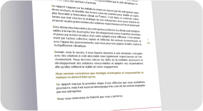 Notre démarche s’inscrit dans une volonté de transparence et d’échanges avec l’ensemble des acteurs économiques, publics et privés, afin de leur permettre de mieux appréhender les enjeux et les opportunités que le défi climatique re- présente dans nos secteurs d’activité. Ce rapport s’appuie sur les initiatives mises en œuvre par les entreprises dans divers secteurs, et identifie des leviers concrets d’action pour établir un cadre plus favorable à l’innovation climat en France. C’est dans ce contexte volon- tariste que doit s’inscrire la stratégie de nos entreprises, avec pour mission de proposer au plus grand nombre des solutions respectueuses de l’environnement. Si les démarches innovantes des entreprises en faveur du climat sont indispen- sables à la marche du progrès, leur développement prend toutefois du temps et passe par la mise en place d’un cadre adapté à leur diffusion. C’est unique- 7 ment par l’action collective, rapide et réfléchie des acteurs économiques, et avec l’appui des gouvernements, que nous pouvons gagner la lutte contre le réchauffement climatique. Demain, nous le savons, il nous faudra répondre à une demande croissante avec des solutions à coût abordable mais également respectueuses de l’en- vironnement. Nous devrons relever les défis de la mobilité, poursuivre le développement des solutions renouvelables et adapter nos organisations afin qu’elles reflètent la réalité de notre engagement. Nous sommes convaincus que stratégie d’entreprise et responsabilité cli- matique ne doivent faire qu’un. Ce rapport marque la première étape d’une réflexion que nous souhaitons poursuivre, mais il est aussi un témoignage très concret des actions engagées par nos entreprises. Nous vous remercions de l’intérêt que vous y porterez. Jean-Pierre Letartre Corinne de Bilbao EY Président France - General Electric Western Europe & Maghreb, President & CEO France Managing Partner