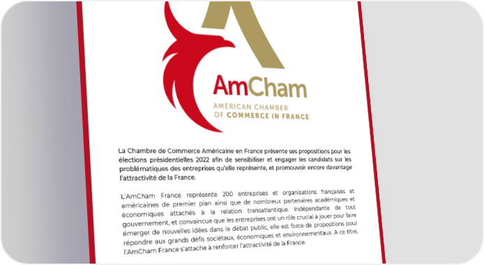 La Chambre de Commerce Américaine en France présente ses propositions pour les élections présidentielles 2022 afin de sensibiliser et engager les candidats sur les problématiques des entreprises qu’elle représente, et promouvoir encore davantage l’attractivité de la France. L’AmCham France représente 200 entreprises et organisations françaises et américaines de premier plan ainsi que de nombreux partenaires académiques et économiques attachés à la relation transatlantique. Indépendante de tout gouvernement, et convaincue que les entreprises ont un rôle crucial à jouer pour faire émerger de nouvelles idées dans le débat public, elle est force de propositions pour répondre aux grands défis sociétaux, économiques et environnementaux. A ce titre, l’AmCham France s’attache à renforcer l’attractivité de la France.