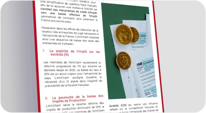 PROPOSITION SIMPLIFIER LA FISCALITÉ ET 1 AMÉLIORER LA COMPÉTITIVITÉ FISCALE Les membres de l’AmCham plaident pour une simplification du système fiscal français afin de lui apporter une meilleure lisibilité. Le transfert des mécanismes de crédit d’impôt vers une baisse effective de l’impôt permettrait de comparer plus aisément la France aux autres pays. Persévérer dans les efforts de réduction de la taxation des entreprises est jugé nécessaire à l’attractivité de la France. L’AmCham propose ainsi une séquence de baisse des taxes des entreprises en 3 phases : I. La stabilité de l'impôt sur les sociétés (IS) Les membres de l’AmCham soutiennent la réforme progressive de l’IS qui entame sa dernière étape en 2022. La baisse du taux à 25% est un atout majeur pour l’attractivité du pays. L’AmCham souligne toutefois la nécessité d’un IS stable dans l’objectif de prévisibilité de la fiscalité française. II. La poursuite de la baisse des Impôts de Production L’AmCham salue la récente réforme des Sociétés (C3S) qui exerce une influence impôts de production diminuant de 50% la néfaste sur la compétitivité française en CVAE et la CFE. Les membres de l’AmCham Europe et freine l’attractivité des chaînes de proposent de poursuivre l’effort vers une production en France. réduction plus poussée afin de permettre aux entreprises de répondre aux attentes salariales et d’investir. III. Les charges sociales Les membres de l’AmCham plaident Les membres de l’AmCham appellent à une également pour une baisse de la taxe baisse des charges sociales en commençant foncière sur les sites de production et sont par les salaires directement liés à la en faveur de la suppression de la production industrielle de biens sur le Contribution Sociale de Solidarité des territoire. d