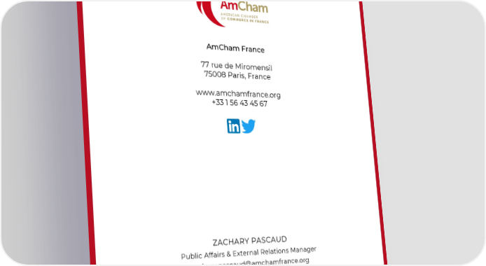 AmCham France 77 rue de Miromensil 75008 Paris, France www.amchamfrance.org +33 1 56 43 45 67 ZACHARY PASCAUD Public Affairs & External Relations Manager [email protected] ZAHIRA BENABDALLAH Membership & Communications Manager [email protected]
