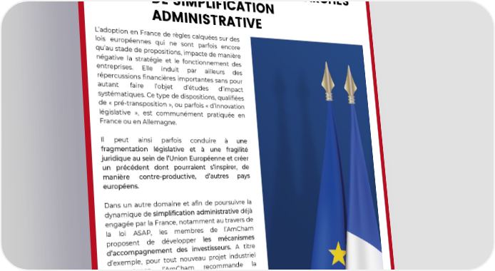 PROPOSITION FACILITER LES INVESTISSEMENTS 2 PAR LA CONSOLIDATION D’UNE DYNAMIQUE D’HARMONISATION RÉGLEMENTAIRE ET LÉGISLATIVE ÉTRANGERS ENTRE LA FRANCE ET L’UNION EUROPÉENNE . ET POURSUIVRE LES DÉMARCHES DE SIMPLIFICATION ADMINISTRATIVE L’adoption en France de règles calquées sur des lois européennes qui ne sont parfois encore qu’au stade de propositions, impacte de manière négative la stratégie et le fonctionnement des entreprises. Elle induit par ailleurs des répercussions financières importantes sans pour autant faire l’objet d’études d’impact systématiques. Ce type de dispositions, qualifiées de « pré-transposition », ou parfois « d’innovation législative », est communément pratiquée en France ou en Allemagne. Il peut ainsi parfois conduire à une fragmentation législative et à une fragilité juridique au sein de l’Union Européenne et créer un précédent dont pourraient s’inspirer, de manière contre-productive, d’autres pays européens. Dans un autre domaine et afin de poursuivre la dynamique de simplification administrative déjà engagée par la France, notamment au travers de la loi ASAP, les membres de l’AmCham proposent de développer les mécanismes d’accompagnement des investisseurs. A titre d’exemple, pour tout nouveau projet industriel d’importance, l’AmCham recommande la création d’un guichet unique disponible en préfecture, dédié au traitement des interrogations relatives aux obligations liées à la sécurité industrielle et à l’environnement et garantissant des délais potentiels de fin de projet.