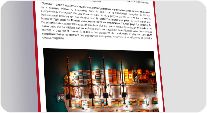 III. Transition ecologique La réindustrialisation représente également une opportunité de transition écologique. Les membres de l’AmCham soutiennent la stratégie environnementale mise en place par l’Union Européenne, notamment via le mécanisme d’ajustement carbone aux frontières (MACF), tout en s’assurant d’une prise en compte des risques de perte de compétitivité qu’il peut engendrer, tels que les impacts mal-évalués sur les chaines de valeurs complexes ou sur les marchés extra- européens, et les risques de conflits commerciaux. L’AmCham avertit également quant aux conséquences que pourraient avoir la mise en oeuvre de « clauses miroirs », proposées dans le cadre de la Présidence française de l’Union Européenne. L’adoption de ces mesures pourrait être perçue par les acteurs du commerce international comme un pas de plus vers le protectionnisme européen et impliquerait une forme d’ingérence de l’Union Européenne dans les régulations d’autres pays. Le contrôle de l’application de ces normes apparaît d’autant plus complexe lorsque l’évaluation se fait dans un autre pays qui ne détient pas les mêmes outils de traçabilité qu’en Europe. Ainsi, les « clauses miroirs » pourraient mener à redéfinir les standards de production, impliquant des coûts supplémentaires et mettant les entreprises étrangères, notamment américaines, en position désavantageuse.