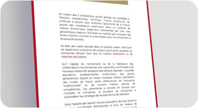 CONCLUSION Au travers des 5 propositions qu’elle adresse aux candidats à l’élection présidentielle, l’AmCham France ambitionne de continuer à œuvrer pour améliorer l’attractivité de la France auprès des investisseurs américains. Dans un contexte de relance économique largement bouleversée par une crise géopolitique majeure, l’AmCham se mobilise pour proposer des leviers d’action concrets et actionnables pour les entreprises et les pouvoirs publics. Au-delà des sujets abordés dans ce position paper, l'AmCham est également consciente des enjeux structurants auxquels les entreprises doivent faire face en matière d’attraction et de rétention des talents. Qu’il s’agisse du recrutement ou de la fidélisation des collaborateurs, les entreprises sont aujourd’hui confrontées à de nouveaux enjeux RH auxquels elles doivent répondre : nouvelles aspirations professionnelles (notamment des jeunes générations), rapport au travail, nouveaux métiers, hybridation des modes de travail, perte d’attractivité de l’entreprise "traditionnelle" ou de certains métiers, pénurie de compétences... Les paramètres à prendre en compte sont multiples et complexes, et poussent les entreprises à reconsidérer leur stratégie de recrutement et de rétention. Cette "bataille des talents" touche aujourd’hui de plein fouet un nombre considérable d’entreprises, à tous les niveaux de l’organisation, indépendamment du secteur d’activité, et ce, partout dans le monde. L'AmCham compte donc se mobiliser au travers du Business Advocacy Bureau en élaborant aux côtés de ses membres des propositions concrètes.